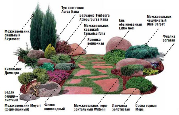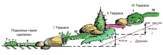 Ci-dessous, vous pouvez explorer plusieurs schémas populaires pour planter des plantes sur un toboggan alpin et choisir la meilleure option pour vous-même: