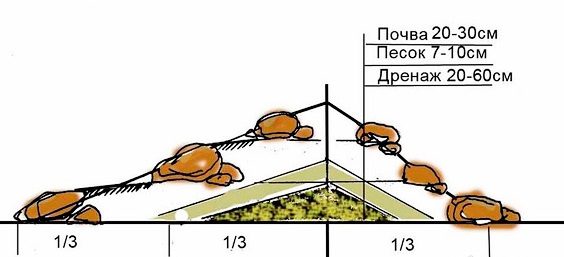 Important! Les pierres ne doivent pas être empilées trop étroitement, sinon il n'y aura pas de place pour les plantes et le développement normal de leur système racinaire. Il devrait y avoir un espace libre entre les pierres, rempli de terre.