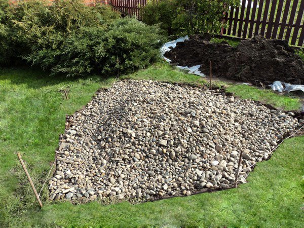 - Il est nécessaire de procéder à un approfondissement à l'endroit choisi d'au moins trente centimètres (de manière optimale 50 cm) et de remplir la fosse de matériau de drainage (l'épaisseur optimale du drainage est de 10 centimètres, et si le sol est très dense, la couche peut être rendue plus épaisse). La pierre concassée, la brique cassée, les pierres de paramètres modérés, le gravier sont idéales.