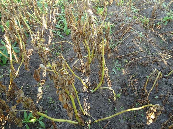 Sur la face supérieure des feuilles (en particulier dans la partie inférieure de la brousse), ainsi que dans certaines parties de la tige, petites mais en augmentation rapide taches brun foncé... En conséquence, les feuilles commencent assez rapidement à se flétrir (mourir), à noircir et à se dessécher ou à pourrir (par temps humide). En conséquence, les têtes de pommes de terre semblent brûlées.