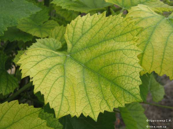 Donc, avec la chlorose de la chaux, les feuilles de vigne virent au jaune (virent au jaune), où les veines restent vertes (ils disent aussi chlorose interveinale des tissus végétaux, c'est-à-dire que l'espace entre les veines devient jaune, pas eux-mêmes), tandis que d'abord, ce sont les feuilles supérieures (jeunes) qui jaunissent.