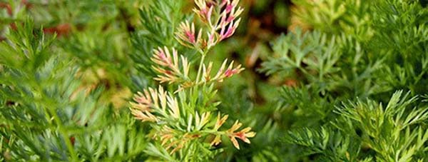 Distinctif signe frappé mouche de la carotte le légume racine est l'acquisition d'une couleur non naturelle caractéristique par les feuilles de carotte : ils deviennent abat-jour violet-rougeâtre (bronze).