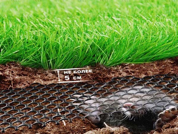 Cela peut être évité en installant un treillis spécial dans la zone sous la pelouse, ce qui protégera la pelouse des taupes et autres parasites souterrains.