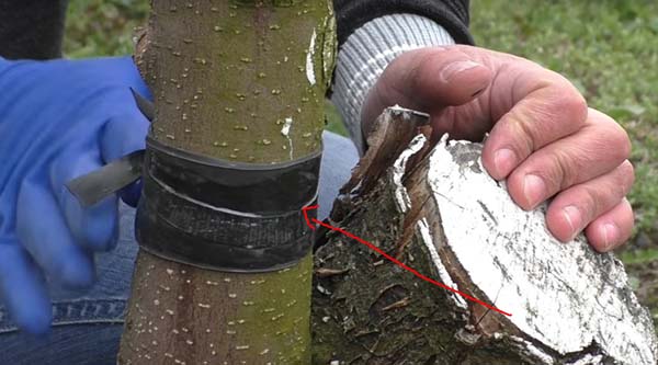 - Prenez 2 élastiques et attachez fermement le large avec le plus étroit sur le tronc afin que les fourmis ne puissent pas ramper sous l'élastique et grimper plus loin le long du tronc.