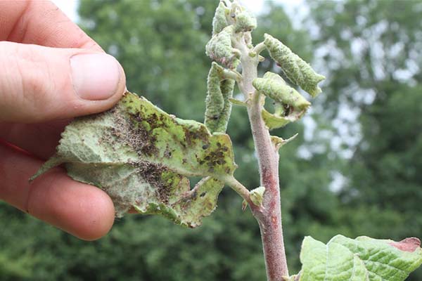 Lorsque vous pulvérisez un arbre, il est impératif d'essayer entrer dans les feuilles enroulées, où, en fait, est le puceron. Par conséquent, il est recommandé d'effectuer le traitement avec des gants, à l'aide desquels vous déplierez les feuilles infectées pendant le processus de pulvérisation.