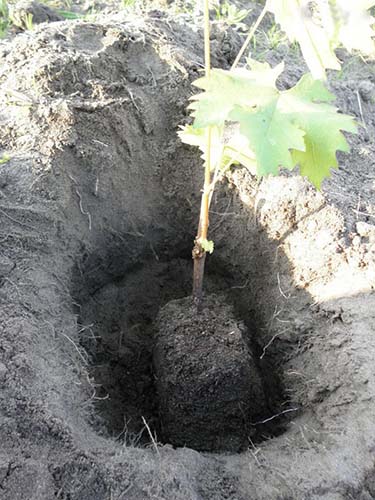 - Les plants de raisin avec ZKS (système racinaire fermé) doivent être plantés de manière à le niveau supérieur du coma coïncidait avec le niveau inférieur du trou, c'est-à-dire que les mêmes 10-20 cm doivent rester à la surface de la terre.