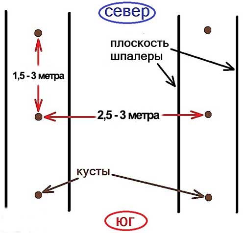 Quant à la distance entre les buissons de raisin, elle devrait être d'environ 2 à 3 mètres et entre les rangées - d'au moins 2,5 à 3 m.