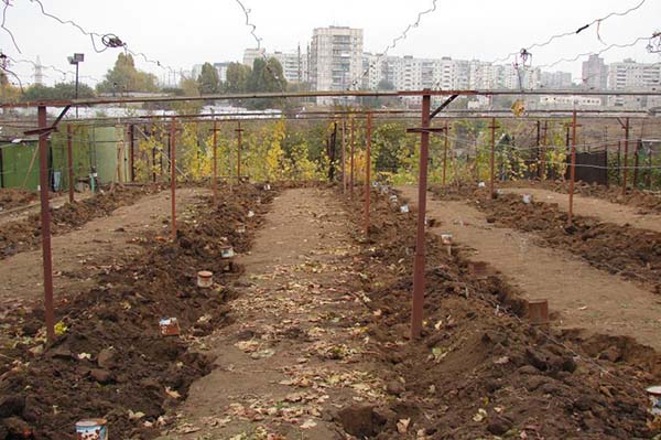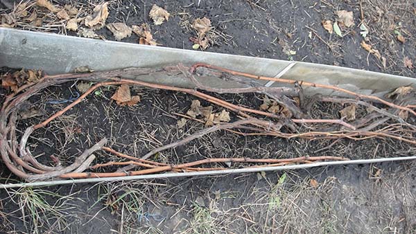 Conseil! Il n'est pas conseillé de poser la vigne dans des rainures profondes, lors des dégels et des pluies, l'eau s'y accumule. Il est beaucoup plus sûr de simplement se coucher sur le sol et de se couvrir, de sorte que vous pouvez certainement éviter l'eau de fonte stagnante.