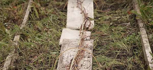 Le moyen le plus simple et le plus naturel de cacher les raisins est de les enfouir dans le sol. Le moment venu, vous devez remplir la vigne précédemment épinglée d'une couche de terre de 20 centimètres, qui doit de préférence être sèche, c'est-à-dire préparée à l'avance. Ou vous pouvez prendre le terrain directement depuis les allées.