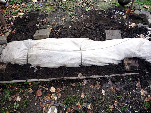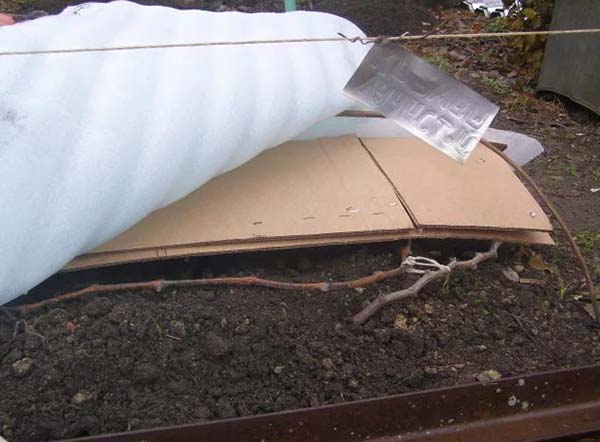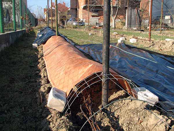 Ou en option pour un abri plus chaud pour les régions du nord - vous pouvez d'abord jeter la vigne dans un fossé (environ 20 cm de profondeur), enveloppé de toile de jute, couvrir d'ardoise, et par-dessus plus couvrir en plus de terre.