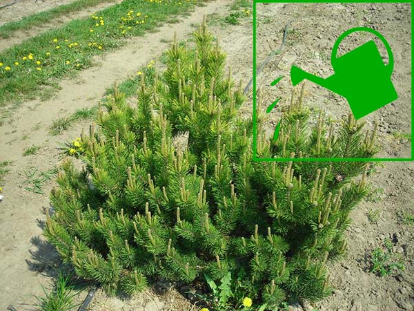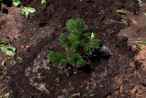 Conseil! Si vous avez une zone désertique, lors de la plantation, il est conseillé d'arroser en plus le plant avec la racine. Et un mois plus tard, nourrissez le pin avec des engrais spéciaux pour les conifères.