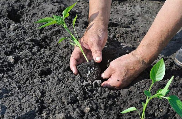 La procédure même pour planter des plants de poivrons en pleine terre est standard: vous transférez les plants dans des trous de plantation pré-préparés, en préservant l'intégrité du coma de terre, puis vous le renversez bien.