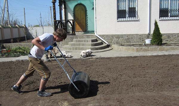 Après avoir roulé le sol parfaitement uniformément, vous pouvez immédiatement semer des graines de gazon à gazon.