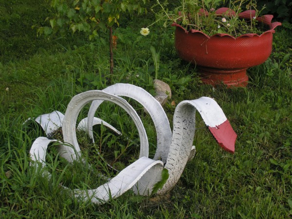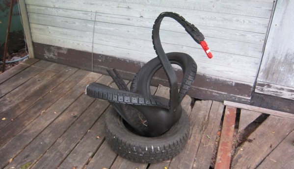 Vous ne devez pas faire une décoration de jardin de vos propres mains à partir de pneus de fabrication étrangère, avec des pointes, avec un cordon métallique.