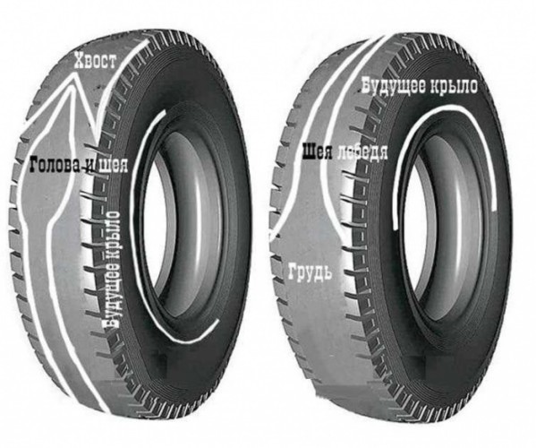 - Prenez le pneu et faites les marques de craie le long desquelles vous allez sculpter l'oiseau désiré. Le futur type de décoration dépend de ce schéma. Tout d'abord, vous devez diviser la roue en deux parties, faire les marques pour la tête, le cou, elles doivent correspondre en longueur à la moitié de la roue. Décrivez ensuite le torse, les ailes, la queue. Une photo avec un schéma de marquage du cygne viendra à votre aide: