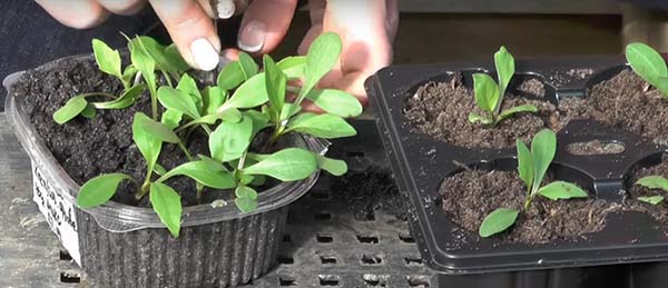 La cueillette se fait de manière standard: nous ramassons doucement la plante avec n'importe quel outil qui vous convient et la transférons dans un nouveau conteneur, où une petite dépression a été faite. Puis arrosez un peu. Si la terre s'affaisse, vous pouvez, si nécessaire, ajouter de la terre aux plants transplantés.