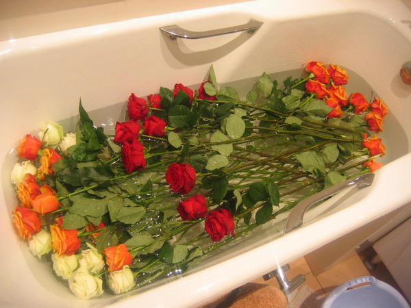 La manière classique! Si on vous présentait des roses et que les bourgeons ont l'air "fatigués" (ils ont baissé la tête), vous pouvez prolonger leur vie dans un vase comme celui-ci: juste mettre pendant 2-3 heures (ou mieux pour une nuit entière - 6-8 heures) dans un bain d'eau froideafin qu'ils absorbent l'humidité et "prennent vie".