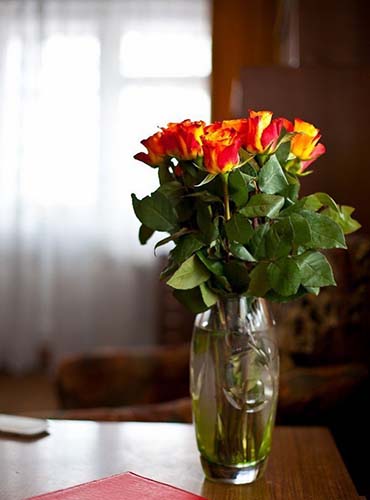 Important! C'est impossiblepour que le vase de fleurs se dresse à côté de la corbeille de fruits. Les fruits sont connus pour émettre de l'éthylène, ce qui affecte négativement le temps de repos des roses.