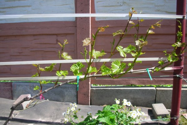 - Après un certain temps, les pousses vertes sont à nouveau liées aux fils supérieurs du treillis.