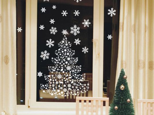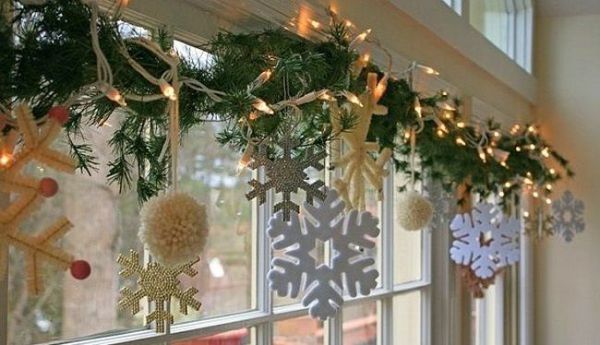 - Flocons de neigedécoupé dans du papier blanc ou coloré. Il existe de nombreux pochoirs qui vous permettent de découper des flocons de neige de formes et de motifs variés.