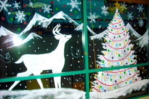 - Peinture sur verre - l'un des types de décoration de fenêtre les plus intéressants. Le tableau anime la pièce et la remplit d'une ambiance festive. Vous pouvez dessiner avec de la gouache, du dentifrice. Les silhouettes d'hiver de la forêt, les attributs du Nouvel An, le symbole de l'année peuvent agir comme un objet d'art.