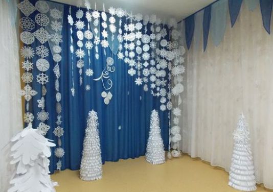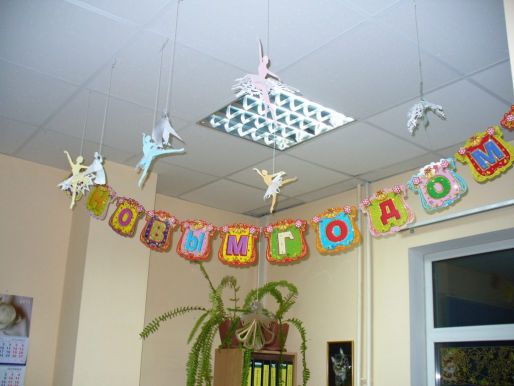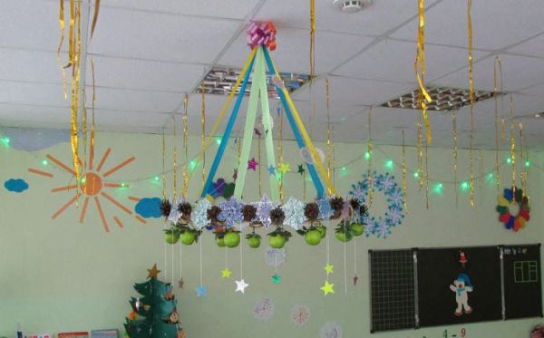 Les options les plus réussies et les plus pratiques pour décorer le plafond de la salle de classe pour le Nouvel An sont les décorations suivantes: