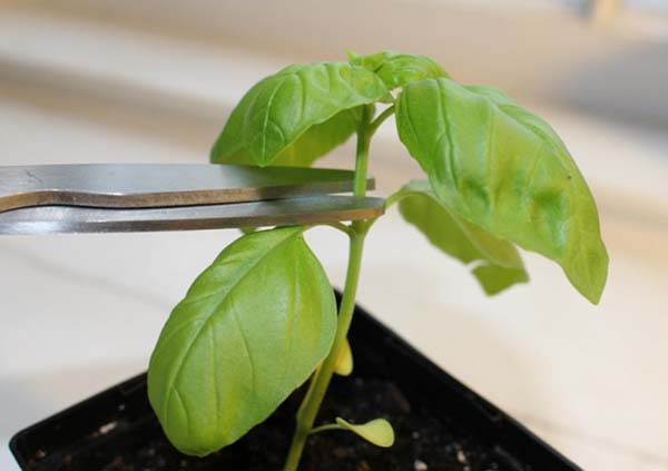Pour que la plante arbore mieux lorsque le basilic est encore petit (1 à 1,5 mois après le semis, quand il a 4-6 vraies feuilles), son sommet doit être pincé, de sorte que la plante pousse non seulement vers le haut, mais donne également des pousses latérales.