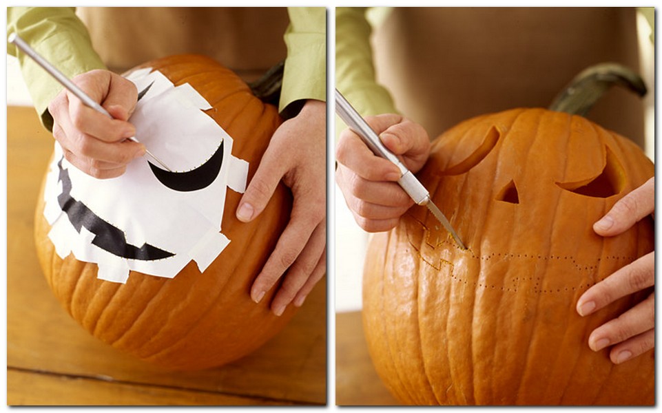 - Étape 3. Après avoir épluché la citrouille, vous devez prendre le modèle de citrouille déjà imprimé pour Halloween et le coller sur la peau.... À l'aide d'un poinçon, le contour du visage de la lanterne est transféré à la surface du légume avec des points (comme sur l'image ci-dessous). Avant de couper, les points peuvent être connectés avec un marqueur.