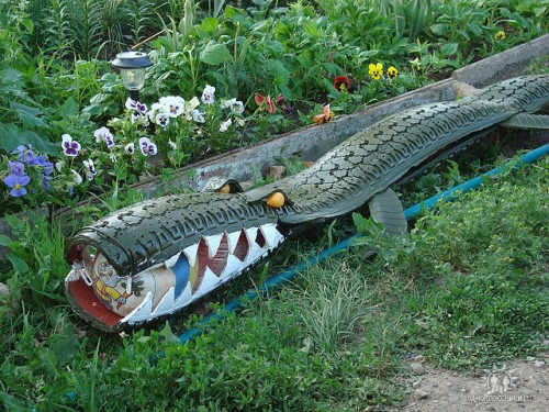 Les prédateurs dangereux dans la nature peuvent devenir de jolis petits animaux à cause des pneus de votre maison de campagne. Les structures vertes auront l'air organiques à côté des fleurs, des arbustes et des arbres.