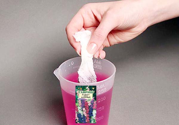 - Désinfectez les graines dans une solution rose de permanganate de potassium pendant 20 minutes (toujours dans un sac ou un paquet de gaze) ou, à votre choix, dans un fongicide spécial comme "Maxim" ou «Fitosporin» dans les 1-2 heures (consommation de fonds 1,5 g pour 1 litre d'eau).
