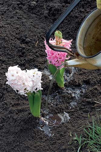 L'arrosage des jacinthes doit être pris au sérieux, la stagnation de l'humidité est contre-indiquée pour les bulbes, mais la terre ne doit pas se dessécher, alors essayez d'humidifier modérément et peu profondément le parterre de fleurs. Surtout souvent (mais pas abondamment), il est nécessaire d'arroser la plante pendant la période de son bourgeonnement et du début de la floraison, ainsi que dans les 2 semaines qui suivent.