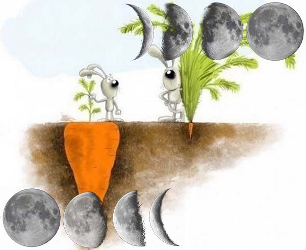 En d'autres termes, ce qui pousse au-dessus du sol (tomates, poivrons, aubergines) est planté lorsque la lune se lève. Au contraire, ce qui pousse vers le bas, sous terre (racines - carottes, betteraves, navets), est semé sur la lune décroissante.