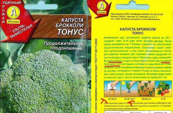 Et le dernier exemple d'instructions sur un paquet de graines de chou brocoli à maturation précoce de la variété "Tonus":