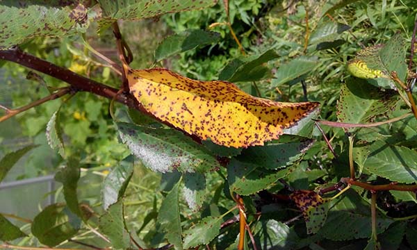 - Sur les feuilles affectées sur la face avant apparaissent petites taches brun rougeâtre, qui au début augmentent progressivement en taille, et après un certain temps se transforment en formations nécrotiques. Les feuilles elles-mêmes sont souvent virent au jaune, puis volent prématurément (déjà en juillet).