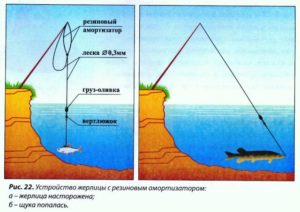 - Avec amortisseur - le gréement d'une telle ceinture de brochet d'été est assemblé de la même manière que le précédent. La différence réside dans la présence d'un amortisseur en caoutchouc fixé parallèlement à la ligne dans un rapport de 4: 1 (ligne: amortisseur), et l'absence de moulinet - tout le gréement est attaché au sommet du poteau. Lors de la morsure, l'amortisseur adoucit très bien les secousses du poisson et contribue à un auto-hachage meilleur et plus fiable.