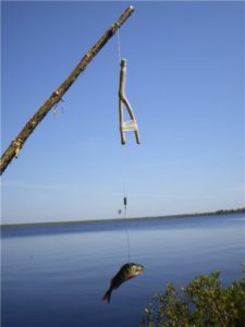 - Équipement de moulage - le matériel appâté est attaché à une perche, à un arbre ou à un piquet enfoncé dans le rivage et soigneusement jeté à l'eau. Pour la pêche sur une petite rivière ou un étang, 3-4 poutres suffisent amplement - ce montant est largement suffisant pour attraper 3-4 brochets avec une activité normale du prédateur. Un grand nombre de galles sont non seulement illégales, mais également incommodes.