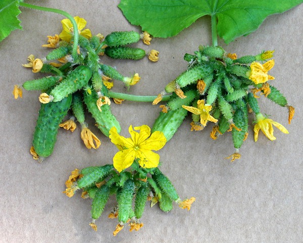 Botte de concombres obtenu leur nom en raison du fait qu'ils se forment dans chaque entre-nœud plusieurs ovaires à la fois (de 3 à 10 ou plus)qui, à maturité, forment faisceaux de zélents.