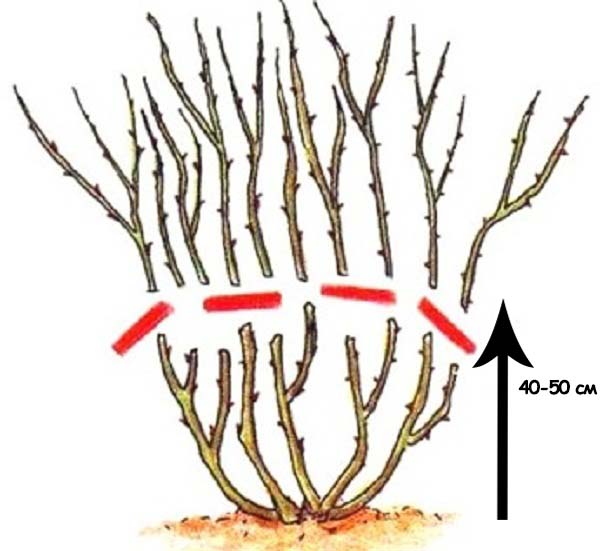 Les roses de thé hybrides pour l'hiver sont taillées environ 1/2 ou à la hauteur de l'abri, en règle générale, ce 40-50 cm du sol. En conséquence, environ 2-4 bourgeons sur chaque pousse.