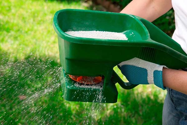 Important! Nourrir la pelouse, comme toutes les autres plantes, ne doit se faire que sur un sol humide, il semblerait donc nécessaire de l'arroser d'abord. Cependant, dans le cas d'une pelouse, au contraire, il est recommandé d'arroser après une distribution uniforme d'engrais sur l'herbe sèche, ce qui peut être fait à l'aide d'un appareil spécial.