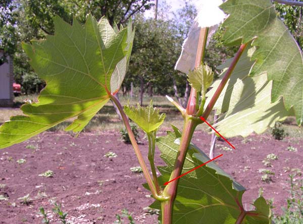 - Donnez les pousses de raisin du beau-fils à pousser un peu, puis coupez-les en laissant 1 feuille sur chaque beau-fils.