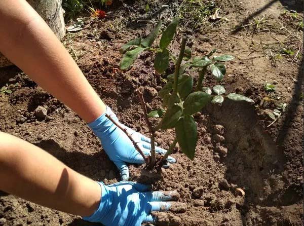 - Presque tout, il ne reste plus qu'à recouvrir les bords vides de terre et, si nécessaire (s'il s'agit d'une rose greffée), remplir le collet radiculaire, puis tasser légèrement (presser avec vos mains).