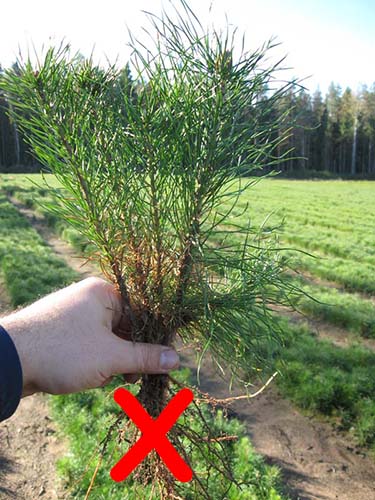 Pour la plantation, il est optimal de choisir des plants de pin âgés de 3 à 4 ans maximum, et encore mieux de naviguer en fonction de leur taille, afin de pouvoir les transporter facilement et correctement sur votre site et de les extraire d'abord sans endommager le système racinaire. En règle générale, la racine a la même longueur que la hauteur de l'arbre, il est donc préférable de déterrer les plus petites.