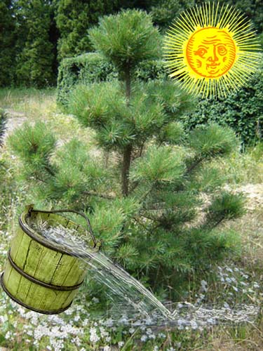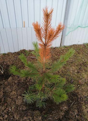Cependant, les jeunes plants, récemment transplantés, ont encore besoin d'un arrosage supplémentaire, même par temps chaud d'été. Il est également important de bien jeter le sol sous un jeune pin à l'automne pour qu'il ne gèle pas autant et que l'arbre ne subisse pas de brûlures printanières car les racines ne peuvent pas prendre de nourriture sur le sol encore gelé.