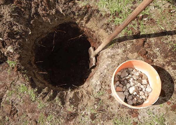 - Posez une couche de drainage au fond de la fosse, versez un peu de terre fertile.