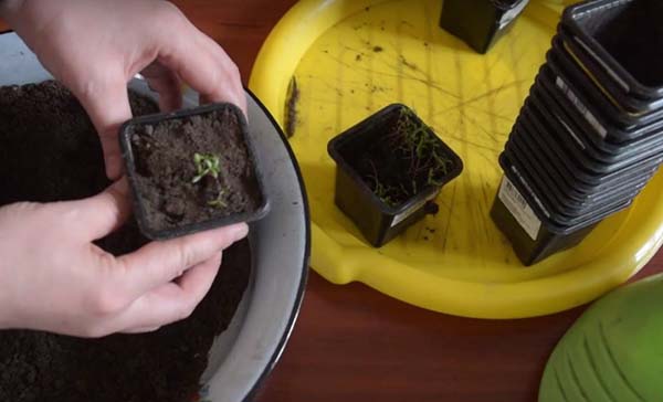 - Prenez un pot de plantation et remplissez-le de terre, mais pas jusqu'au sommet. Si les plants s'étirent, vous aurez la possibilité de verser de la terre sous eux.