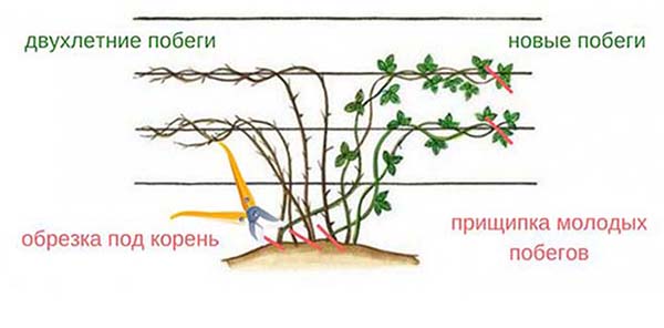 - Respectivement, après récolte (automne) et / ou au printemps vous devez vous assurer de tailler vos mûres chaque année. En outre, pour augmenter le rendement, on utilise le pincement, le pincement ou la poursuite des pousses (élimination des sommets des pousses), visant à réveiller les bourgeons latéraux et une meilleure ramification (formation de pousses latérales).