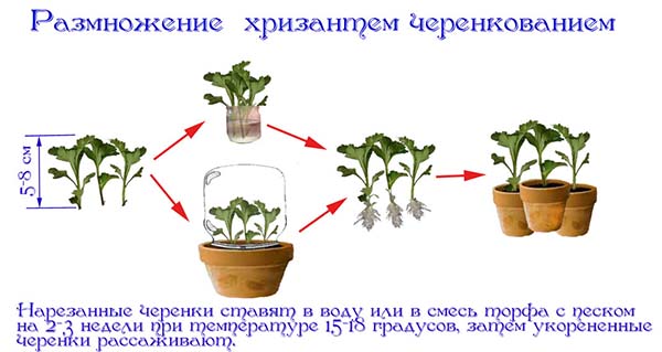 Il est pratique de couper les chrysanthèmes lors de la taille d'automne. Pour ce faire, vous devrez couper, ou mieux casser, des pousses de 5 à 8 centimètres (les fleurs elles-mêmes doivent être coupées et il ne reste que quelques feuilles), qui peuvent être enracinées dans un verre d'eau ou dans un récipient commun dans un substrat spécial (de tourbe et sable ou dans un mélange de perlite avec la même tourbe) et recouvrir d'un sac plastique pour créer un effet de serre.