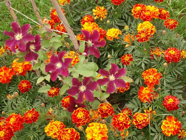 Conseil! C'est très bien si vous plantez des annuelles à faible croissance à côté de la clématite pour que le sol ne se dessèche pas et que la partie inférieure des tiges soit également couverte. Tout cela est très bénéfique pour la plante. Les meilleurs voisins pour cette vigne seront souci et calendula, ils pourront également protéger la plante des insectes ravageurs (effrayer leur odeur).