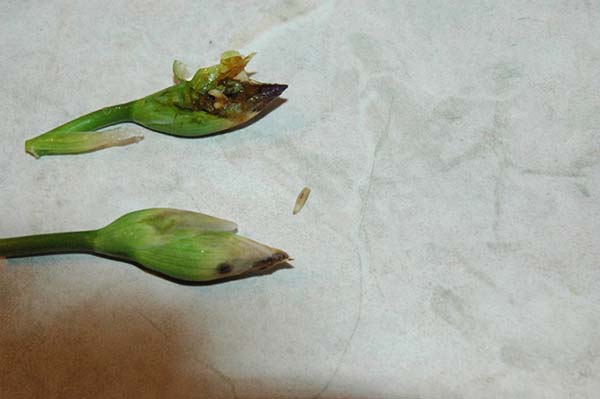 Si les iris ne fleurissent pas et qu'une pourriture collante s'est formée à l'endroit où la fleur devrait se trouver, ce sont en fait les larves de la mouche de l'iris qui ont essayé.