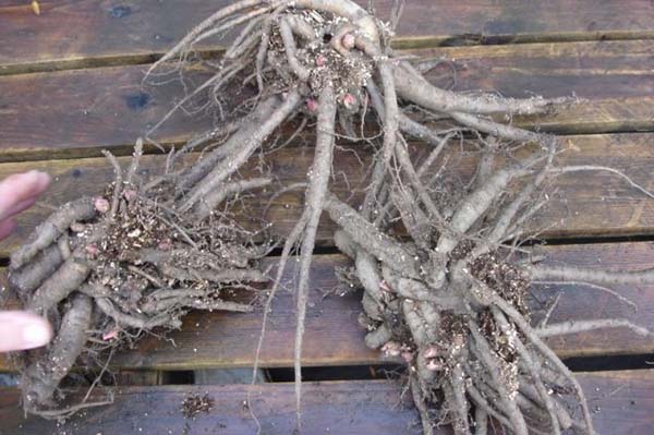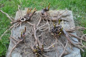Vous ne devriez pas acheter de semis séchés - il est difficile voire impossible de les ramener à la vie. Non viable non plus points de croissance secs noirs. Il ne faut pas faire confiance aux assurances du vendeur que les reins endormis se réveilleront, il est peu probable que cela suive. Surtout vous ne devriez pas acheter de très petites racines sans reins.